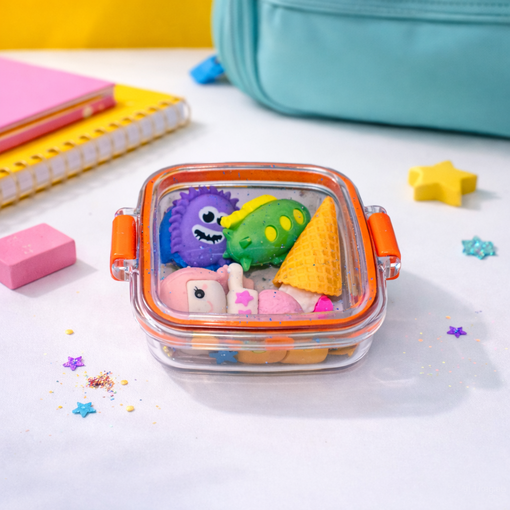 📦 Compact lock-style box keeps erasers safe and easy to carry in school bags.